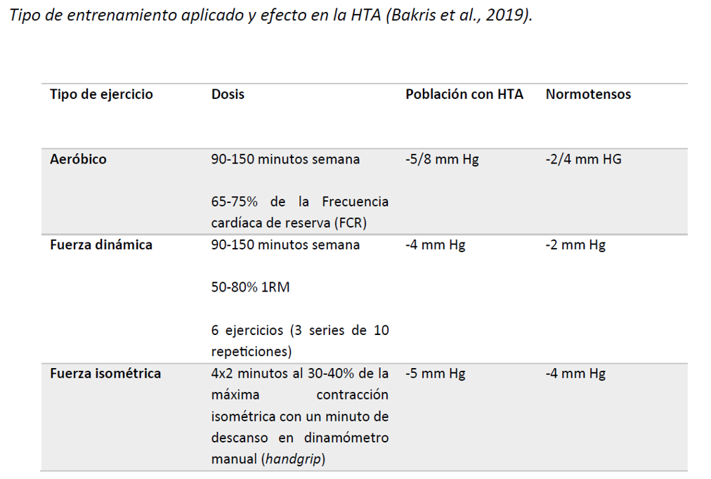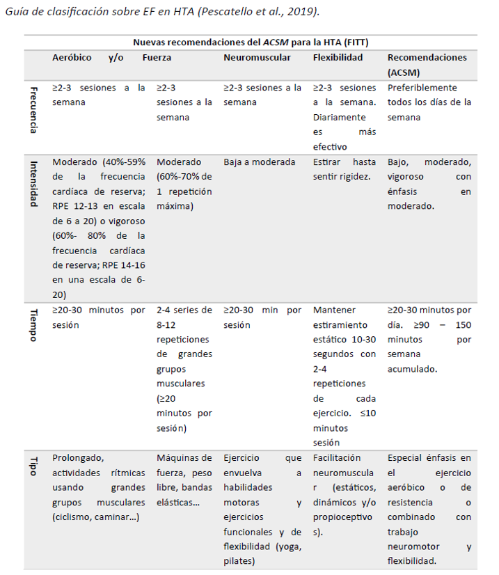 Por otra parte, Pescatello et al. (2019) definieron, mediante el Colegio Americano de Medicina del Deporte (ACSM), unas recomendaciones en cuanto a Frecuencia, Intensidad, Tiempo y Tipo (FITT) de ejercicio físico en sujetos diagnosticados de hipertensión arterial. En la siguiente tabla se puede observar dichas recomendaciones: